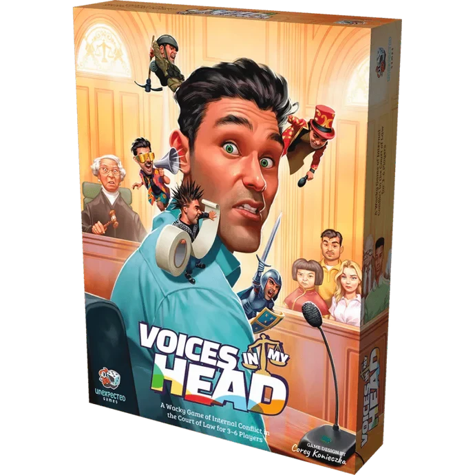 In Voices In My Head, players step into the courtroom and into the mind of a man on trial for robbing a bank. One player takes on the role of the prosecutor who is trying to convict the defendant, Guy, and send him to prison; everyone else takes on aspects of Guy’s personality, such as Honesty or Selfishness, and attempts to influence the trial. To win the game, each player must achieve their hidden goal.