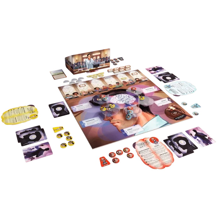 Each round, the prosecutor plays a trial card to present evidence, call witnesses, or grill Guy on the stand. Players then try to control Guy’s actions by deploying control markers to a three-dimensional game board representing his brain. These actions will sway the jury in different ways and ultimately determine whether Guy goes free or is sent to prison.