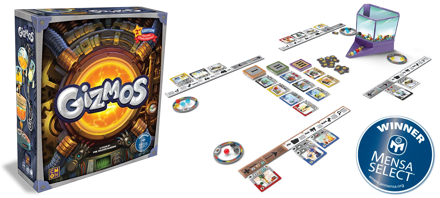 In Gizmos, players take on the role of contestants in the Great Science Fair. They will pluck energy marbles from the innovative plastic Energy Dispenser and use them to construct new Gizmos, adding them to their machines. Players will have to plan ahead as they build, since Gizmos can chain-react off of one-another. As more Gizmos are added, more reactions can trigger, creating some truly epic turns. In the end, the player with the most Victory Points is declared the winner.