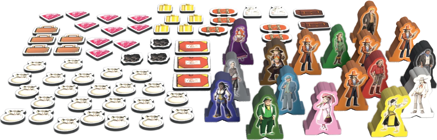 This box was designed to delight Colt Express fans! It brings original content and exclusive, high-quality game elements, such as wooden screen-printed pawns and tokens, as well as two new bandits to play with even more players.