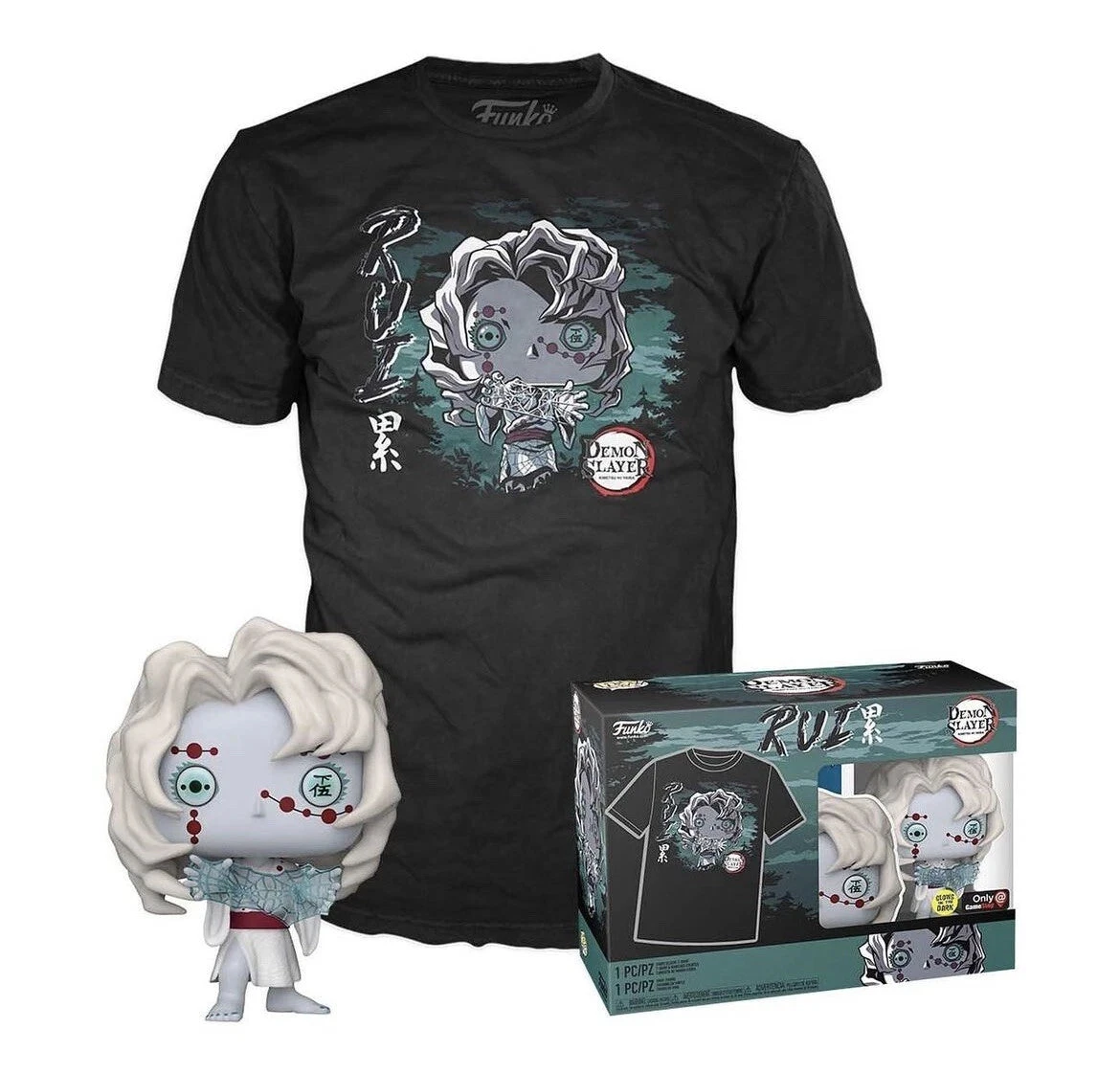 This crew-neck tee comes with a matching, glow-in-the-dark Pop! Rui. This Pop! & Tee set is perfect for showing off your Demon Slayer pride in your collection and on the go!