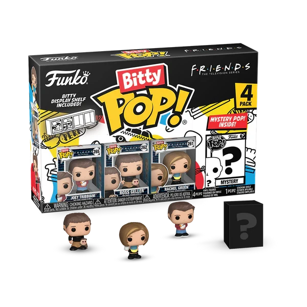 Your favourite Friends™ Pops! have been shrunk into Bitty Pops! Expand your collection with this assortment of Bitty Pop! figures featuring your most beloved sitcom characters as miniaturized figures! This 4-pack includes Bitty Pop! Joey Tribbiani™, Bitty Pop! Ross Geller™, Bitty Pop! Rachel Green™, and a mystery Bitty Pop! figure. The possible mystery Bitty Pops! are Hyper Rare (1/6) Joey Tribbiani™ (Cowboy), Hyper Rare (1/6) Phoebe Buffay™ (Music Video), Rare (1/3) Phoebe Buffay™ (Halloween Costume), and Rare (1/3) Joey Tribbiani™ (in Chandler’s clothes). Bitty Pops! are packaged in hard acrylic cases with detachable bottom lids. Detachable bottom lids double as acrylic bases, to which the Bitty Pop! figures are adhered. Sort and arrange your Bitty Pops! with the included display case! Acrylic display cases are stackable and hold four Bitty Pop! figures each. Vinyl figures are approximately 2.3 cm tall. Four figures per single package purchase. Warning: Choking Hazard. Collectibles are small. Not for children under the age of 3 years old. Item selection is random, as each piece is in blind packaging. We cannot accept requests for specific items. You may receive duplicate figures.