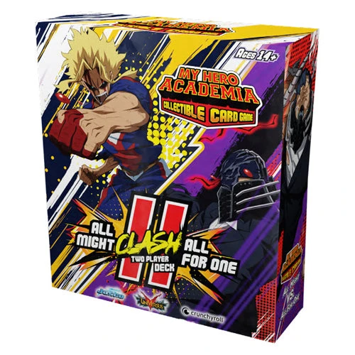 All Might and All for One face off in an epic showdown with this 104-card two-player set for the MY HERO ACADEMIA COLLECTIBLE CARD GAME! Features two 51-card decks that are ready to play right out of the box and can be expanded
