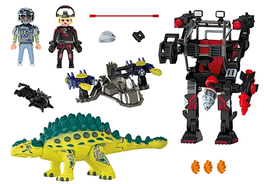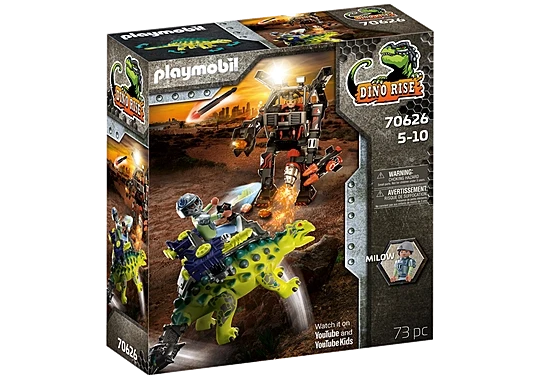 The villain attacks with his hyper-modern robot fighter. The lightning-fast cannons, make the robot extremely dangerous and difficult to stop. But fortunately the brave team around Ian has made it their mission, to fight the soulless robots of the Comet Corporation with all means at their disposal. On the back of his Saichania, clever Milow tries to thwart the plans of the fighting machine. This dino-human power team is hard to beat.