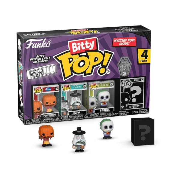 Your favourite Pops! have been shrunk into Bitty Pops! Expand your The Nightmare Before Christmas™ collection with this assortment of Bitty Pop! figures featuring your most beloved Halloween Town residents! This 4-pack includes Bitty Pop! Pumpkin King, Bitty Pop! Mayor (frowning), Bitty Pop! Barrel, and a mystery Bitty Pop! figure. The possible mystery Bitty Pops! are Hyper Rare (1/6) Mayor (smiling), Hyper Rare (1/6) Snowman Jack, Rare (1/3) Oogie Boogie (with bugs), and Rare (1/3) Harlequin Demon. Bitty Pops! are packaged in hard acrylic cases with detachable bottom lids. Detachable bottom lids double as acrylic bases, to which the Bitty Pop! figures are adhered. Sort and arrange your Bitty Pops! with the included display case! Acrylic display cases are stackable and hold four Bitty Pop! figures each. Vinyl figures are approximately 2.3 cm tall. Four figures per single package purchase. Warning: Choking Hazard. Collectibles are small. Not for children under the age of 3 years old. Item selection is random, as each piece is in blind packaging. We cannot accept requests for specific items. You may receive duplicate figures.