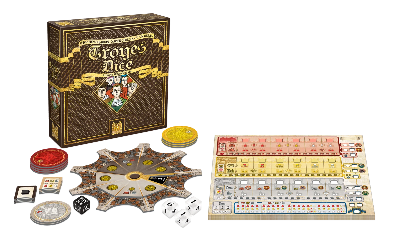 Troyes Dice doesn’t attempt to completely replicate the original game, rather it looks to take on the theme and some of the more memorable aspects of the game. The central player board has cut outs for circular tokens that are double sided and each side is one of three colours, yellow, white or red. Three of the four dice you will roll each round are translucent and they take on the colour of the token below them. The fourth is black and bad news.